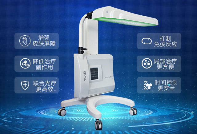 我院特从韩国引进的V-DⅢ光动力治疗仪,利用波长为290-320nm的中波宽谱紫外线(BB-UVB),作用于皮肤中7-脱氢胆固醇,形成维生素D3,可抑制免疫反应,使身体重获维生素D3自我生成的能力,这一点是通过药物和食物补充无法达到的效果。同时,紫外线照射可使角质形成细胞形成多种白介素和肿瘤坏死因子,参与免疫细胞激活、分化、增殖。随着照射使免疫球蛋白形成增多,增加补体活性和网状内皮细胞的吞噬能力,改变T细胞亚群成分等。而皮肤基底层的黑素细胞吸收紫外线后产生更多的黑素颗粒并输送到角质形成细胞中,可增强皮肤的屏障作用,对皮肤表面具有杀菌作用,可谓多效合一。